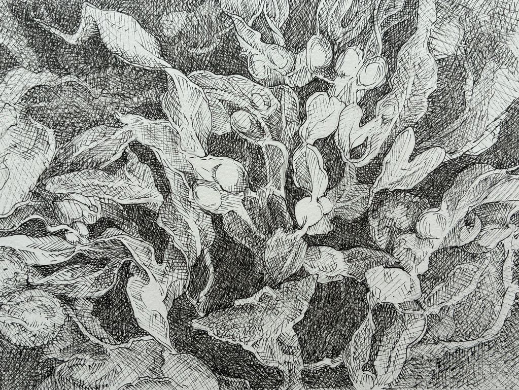 "Seaweed Crosshatch", 7" x 5" India Ink, 2026